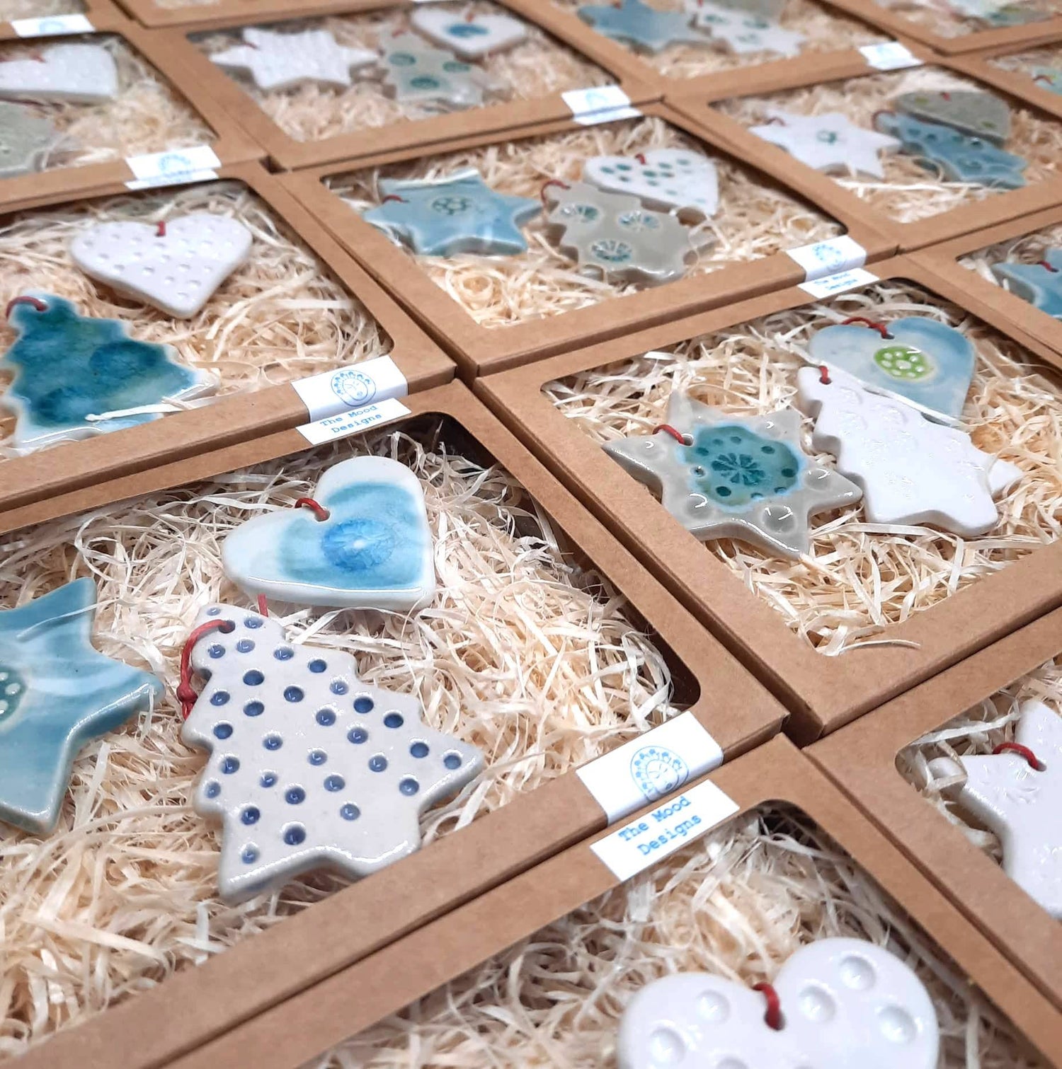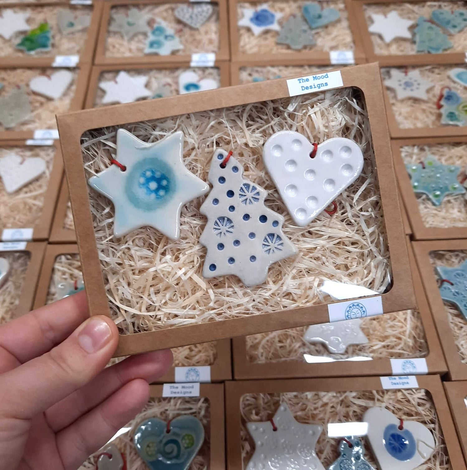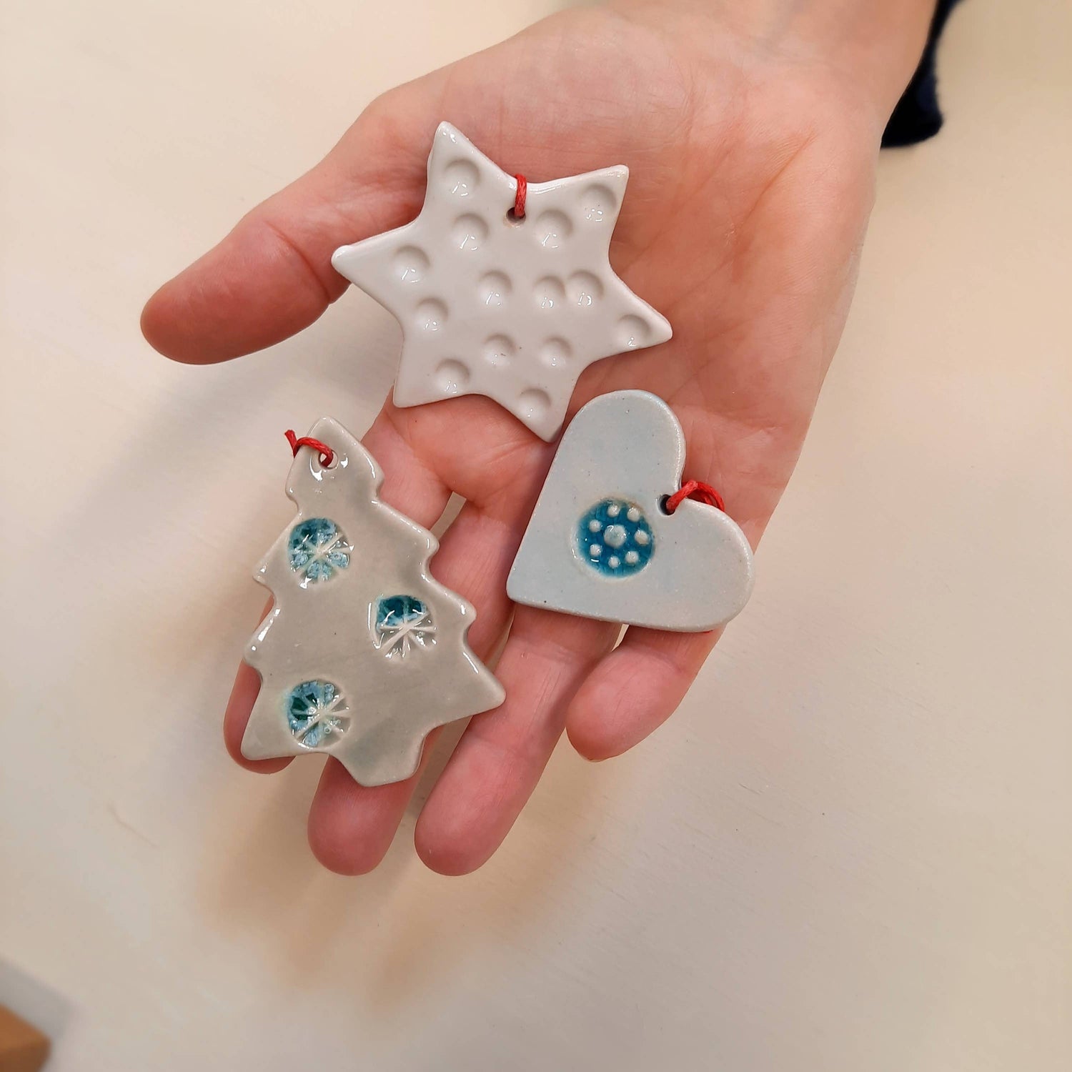 Ajoutez une touche de charme artisanal à votre décoration de Noël avec notre ensemble de 3 décorations en terre cuite assorties. Chaque pièce est légèrement différente, ce qui les rend uniques. Les palettes de couleurs comprennent le blanc, le gris, le vert et le bleu, avec une ficelle en coton ciré attachée pour une accroche facile.