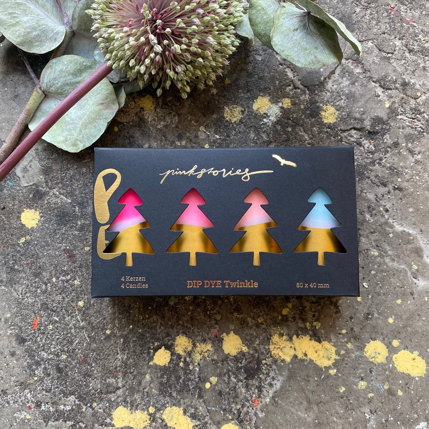 En raison du travail manuel, les motifs peuvent varier et les rendre uniques. Ensemble de quatre bougies en forme de colonne emballées dans une boîte de Noël de haute qualité avec gaufrage métallique.