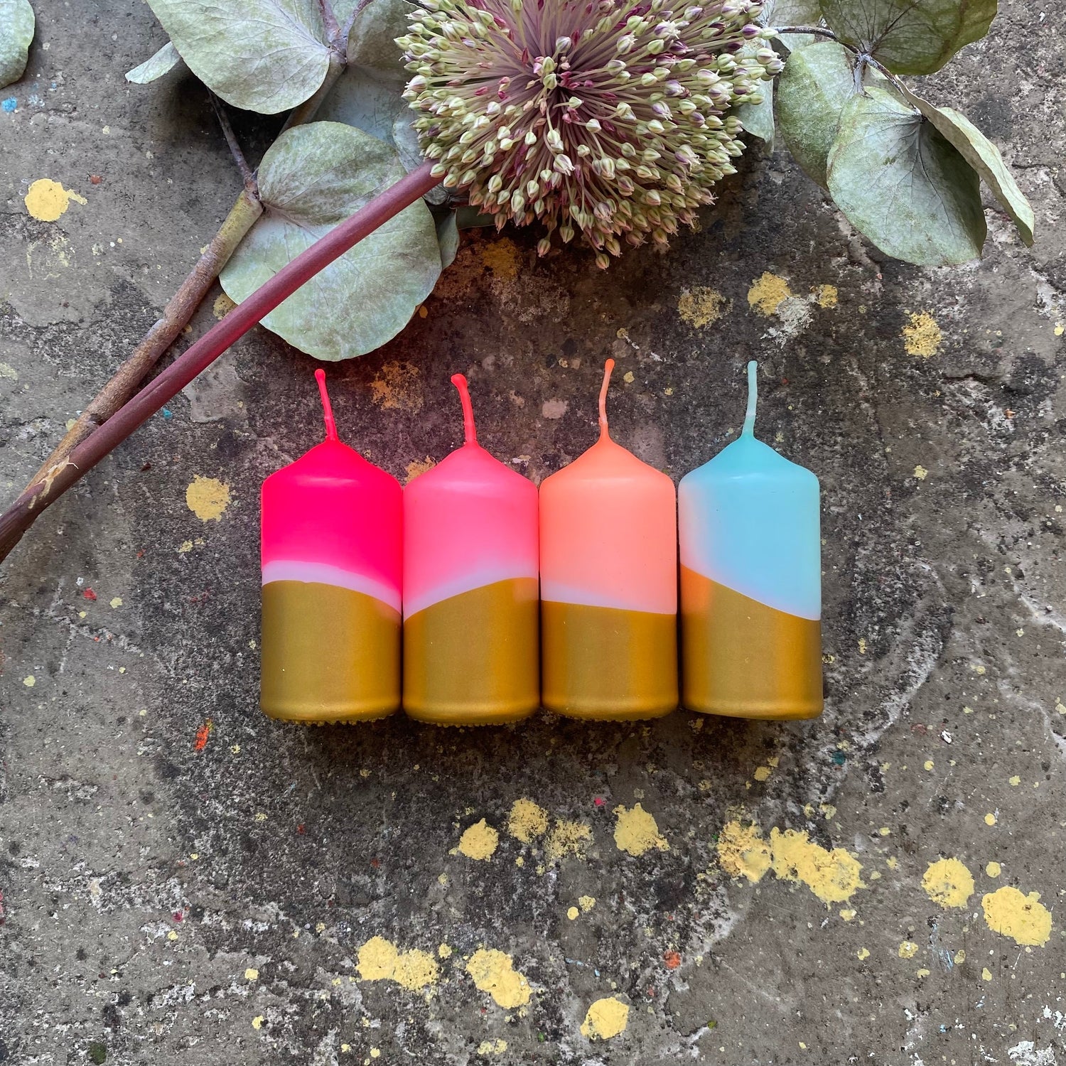 Bougies piliers joliment trempées à l'aspect doré, fabriquées à partir de paraffine soigneusement sélectionnée. Fabriqué à la main dans les contreforts pittoresques des Alpes bavaroises.