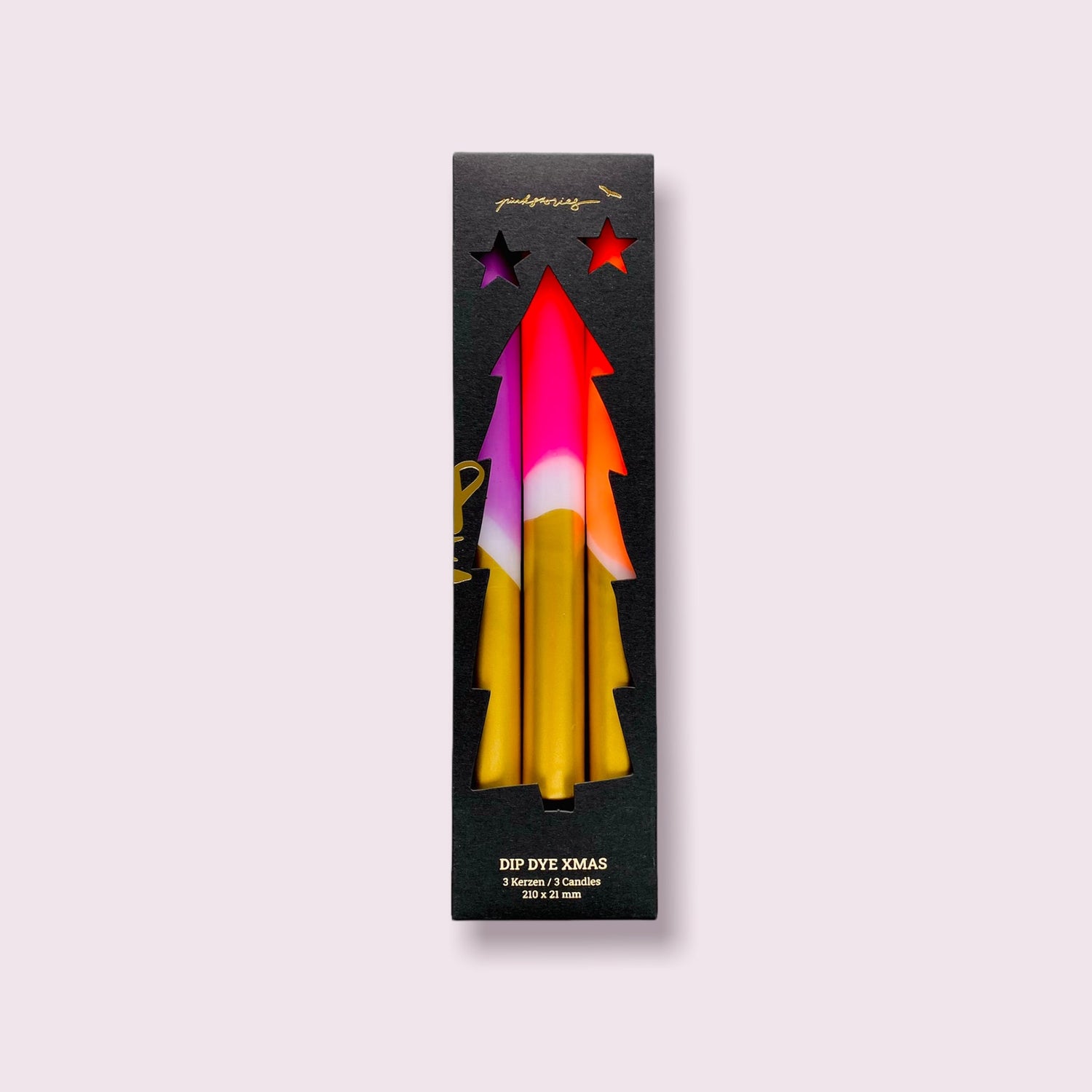 Ensemble de trois bougies de dîner emballées dans une boîte de Noël de haute qualité avec gaufrage métallique.