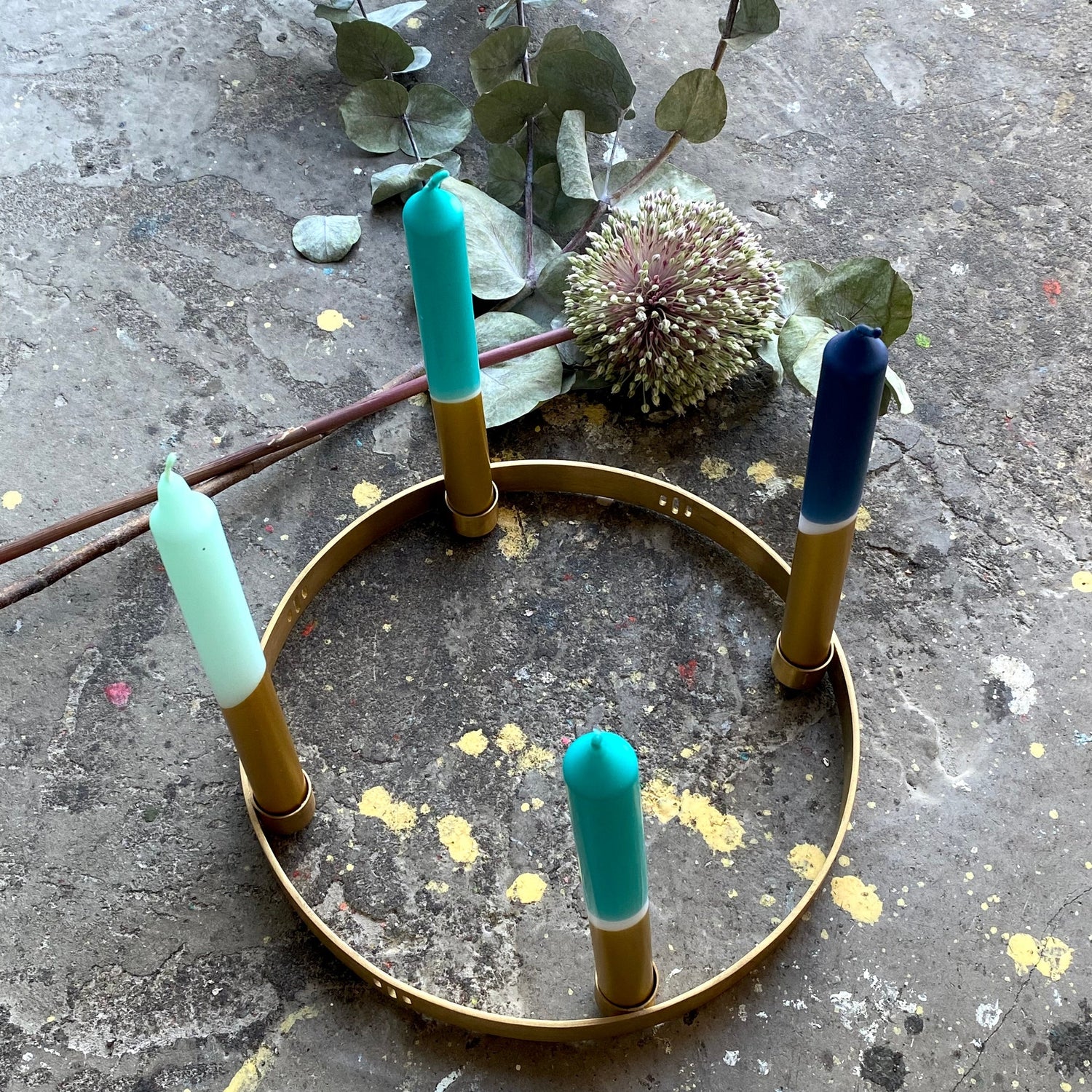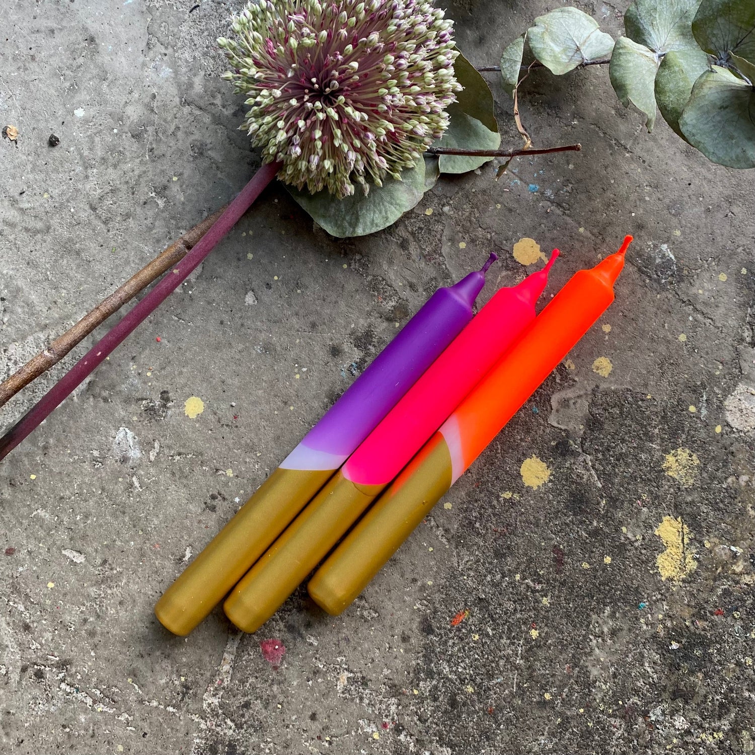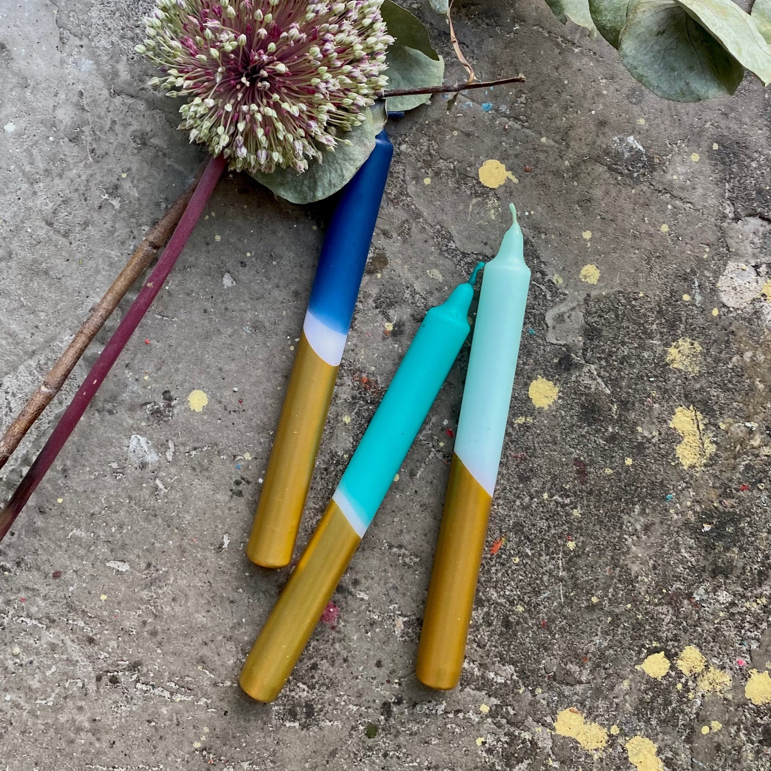 Bougies de table joliment trempées à l'aspect doré, fabriquées à partir de paraffine soigneusement sélectionnée. Fabriqué à la main dans les contreforts pittoresques des Alpes bavaroises. En raison du travail manuel, les motifs peuvent varier et les rendre uniques.