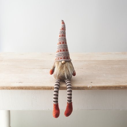 Un adorable gonk en tissu conçu pour être posé sur une étagère, avec une barbe duveteuse, des jambes rayées tricotées et un chapeau à motifs